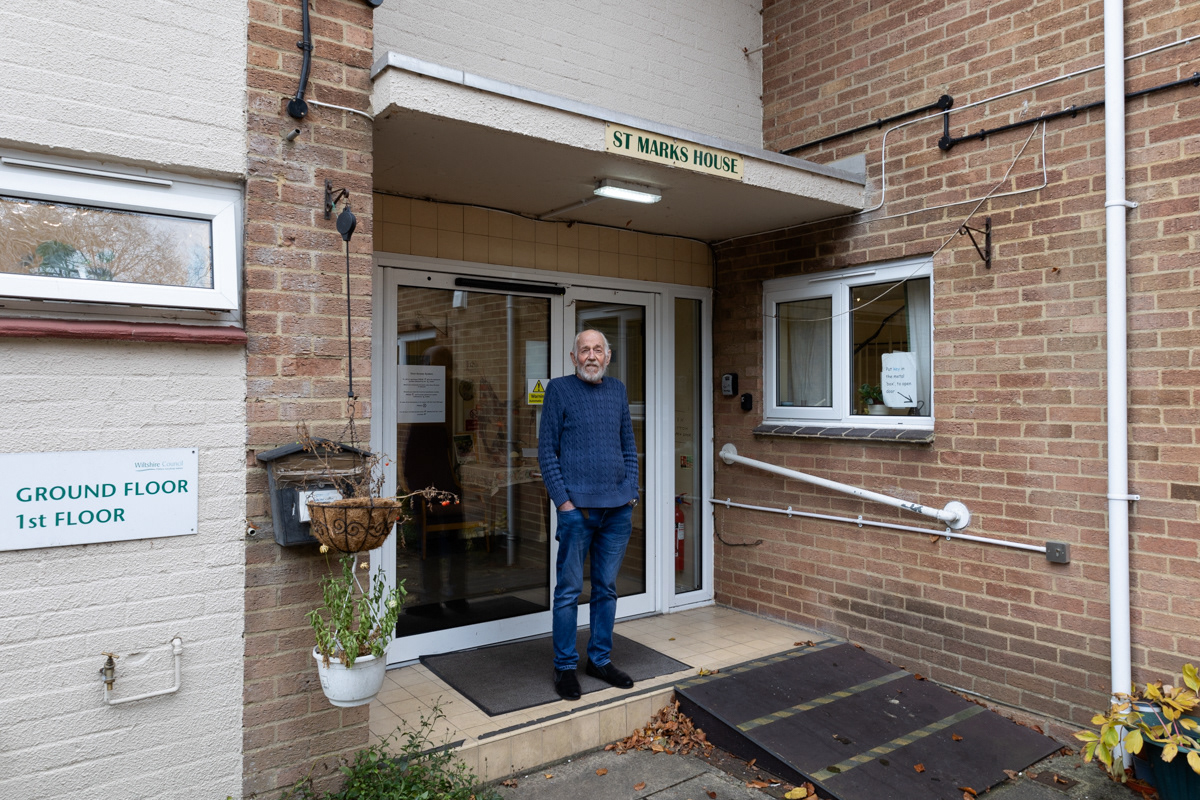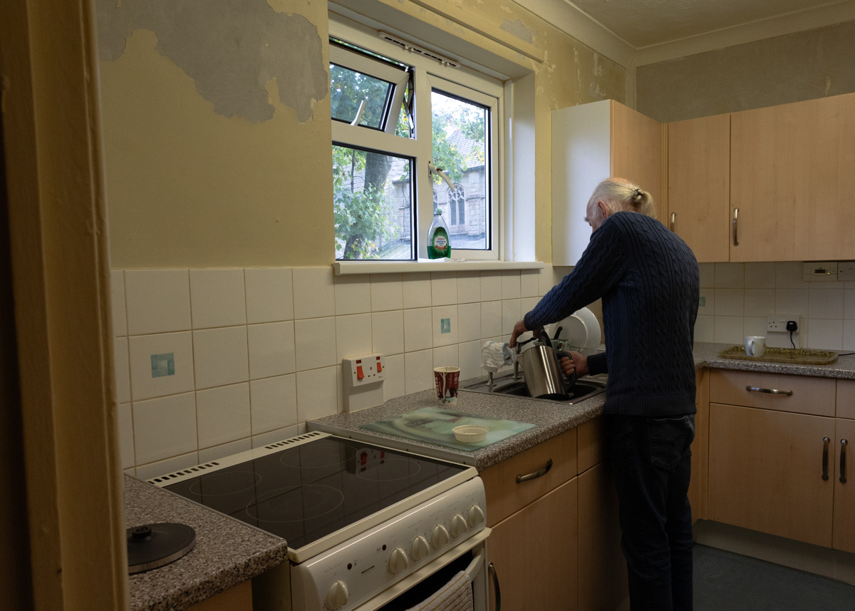 Born in 1948 in Suffolk, Terence Rossiter resides in St. Mark's House in Salisbury, Wiltshire. The block, described on the Wiltshire Council website as being amongst a "fairly quiet residential area, although surrounded by Salisbury City ring-road", consists of 24 dwellings, as well as a shared common space, kitchen and laundry room. Terence has led a varied life, working in remote parts of New Zealand in his twenties, later starting a family after returning to the UK. He moved to Salisbury a few years later, where he met his second wife, Sandra, and had two children, including my mother. This series of five images follows Terence through a few hours of an ordinary day in October, offering an observation of the quiet rhythms, gestures and spaces that shape his life and reveal the man I know as my grandad.